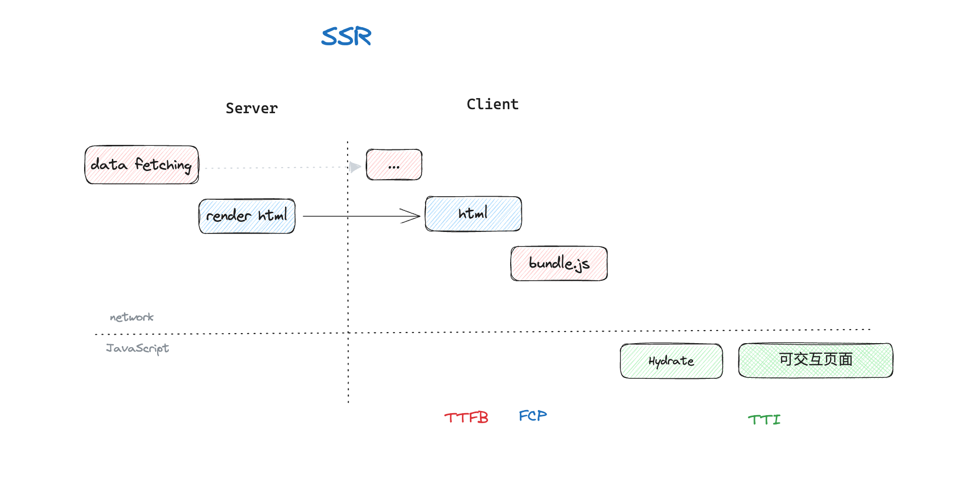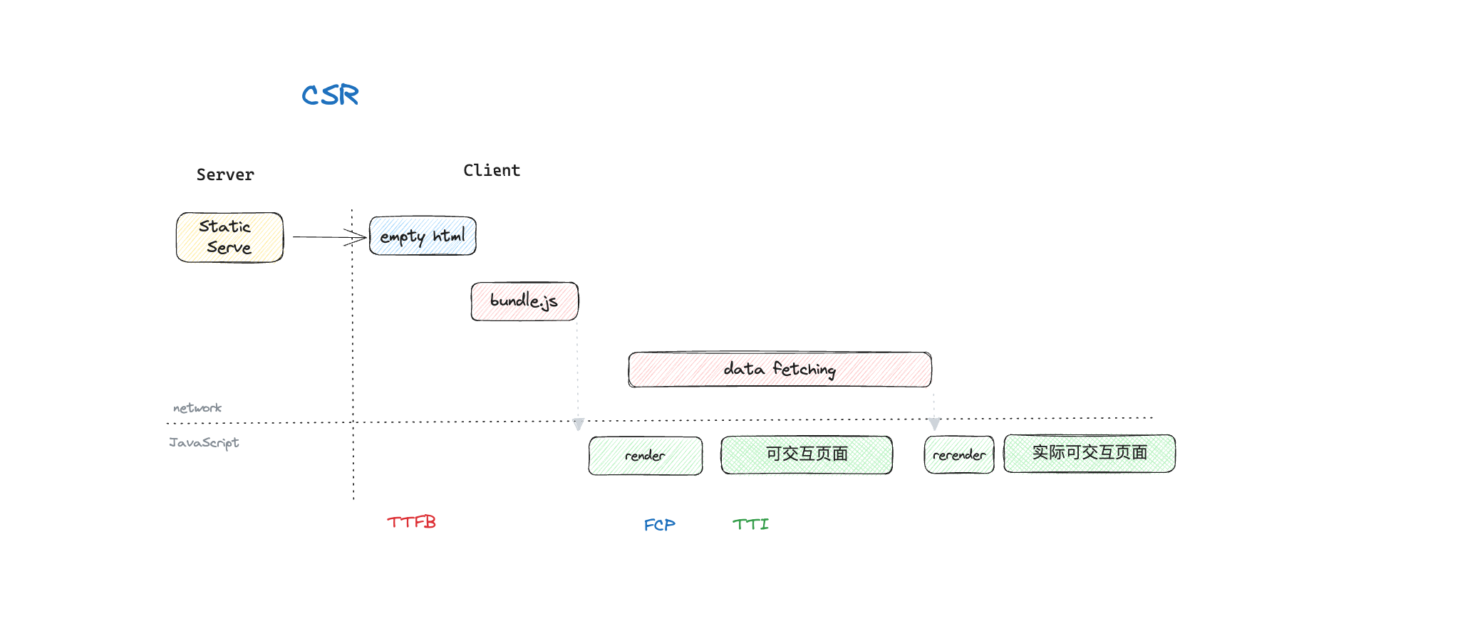 SSR(Server-Side Rendering)将获取数据的过程放在了服务端,主要解决 CSR 首屏性能和 SEO 问题。