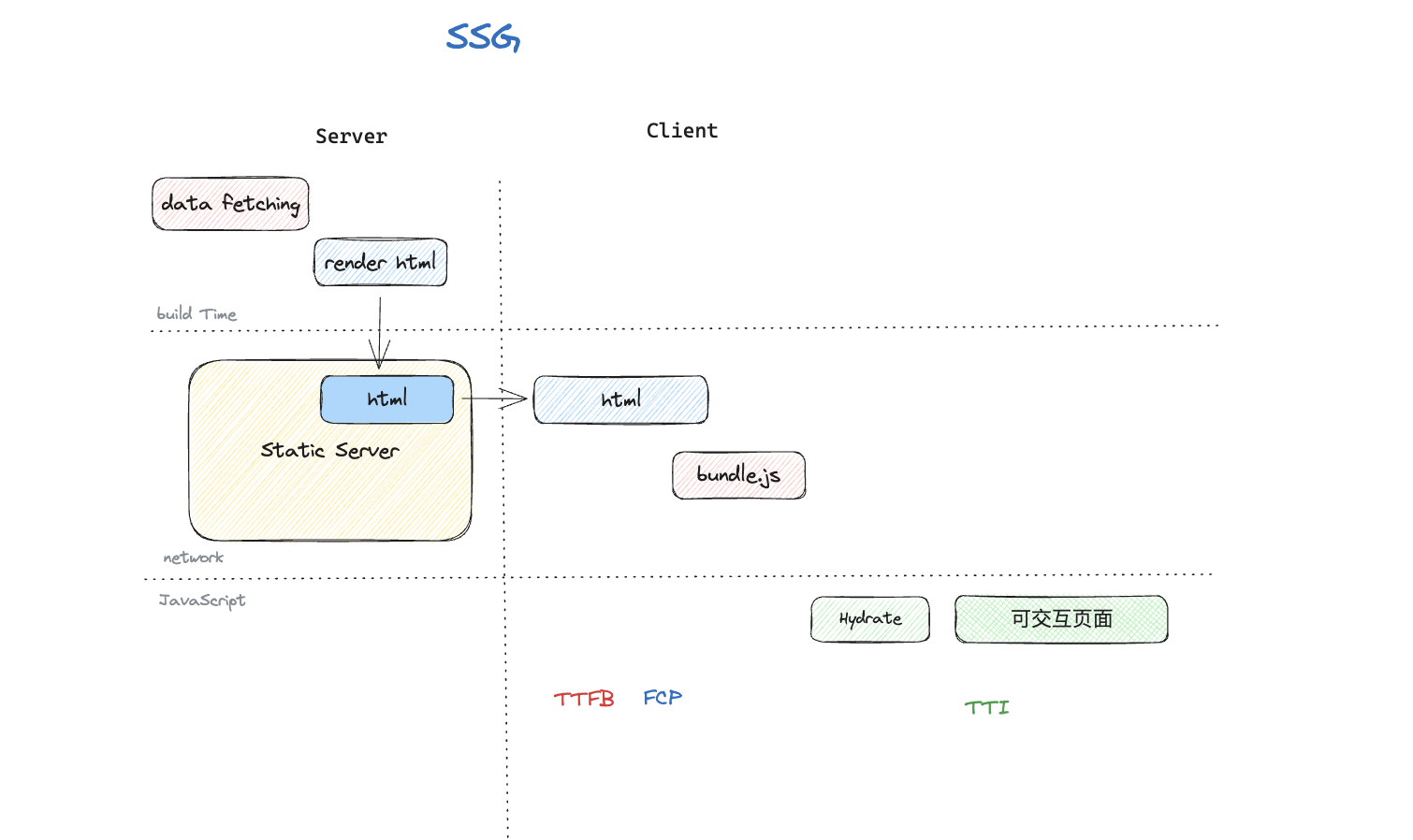 SSG(Static Side Generation)利用动态数据构建渲染,因为是静态的,部署在静态服务器即可。纯静态页面也可以使用 SSG 构建。